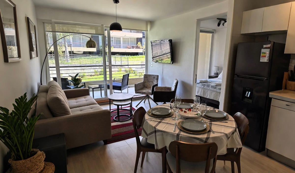 El departamento está hermosamente decorado y tiene un balcón con vista parcial al volcán. 100% Equipado para 2 huéspedes: 🍽️ Cocina full equipada 🏋️ Gimnasio a libre disposición. ☕ Cafetera francesa y galletas biscoff 💻 Wifi y Smart TV 🏊 Piscina, disponible según temporada 👾 Sala de juegos 💡 Atención personalizada y recomendaciones locales Queremos ofrecerte una estadía ✨ 5 estrellas ✨ y que disfrutes al máximo tu tiempo con nosotros!