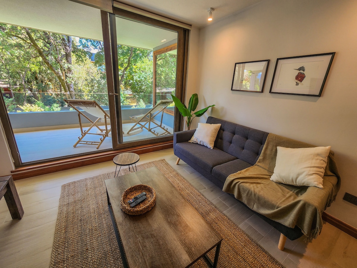 ✨ Este departamento es un oasis moderno y cálido diseñado para que disfrutes cada momento de tu estadía. 🏡 Full Equipado para 2 huéspedes: 🍳 Cocina completamente equipada 💻 Espacio de trabajo con luz natural 🛋️ Living con Smart TV y juegos de mesa 🏊♀️ Piscina, sauna, gimnasio y sala de juegos 🍷 Balcón con vistas verdes perfectas para el relajo 🎁 Atención personalizada para vivir una experiencia inolvidable. ¡Tu descanso 5 estrellas está aquí!