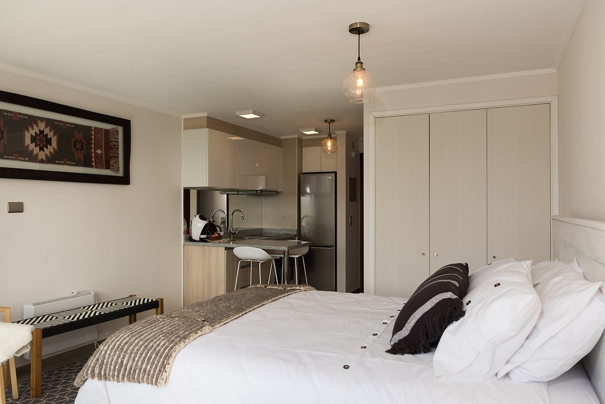 Departamento estudio cercano al centro. Completamente amoblado, con ventanas de termopanel y vista al volcán. El dpto incluye: Cama matrimonial Cocina americana equipada Amplia terraza equipada Parrilla eléctrica Calefactor eléctrico Estacionamiento privado *Se desinfecta con Amonio Cuaternario. Otros servicios: Piscina exterior, gimnasio, sauna, sala de juegos, quincho y lavandería.