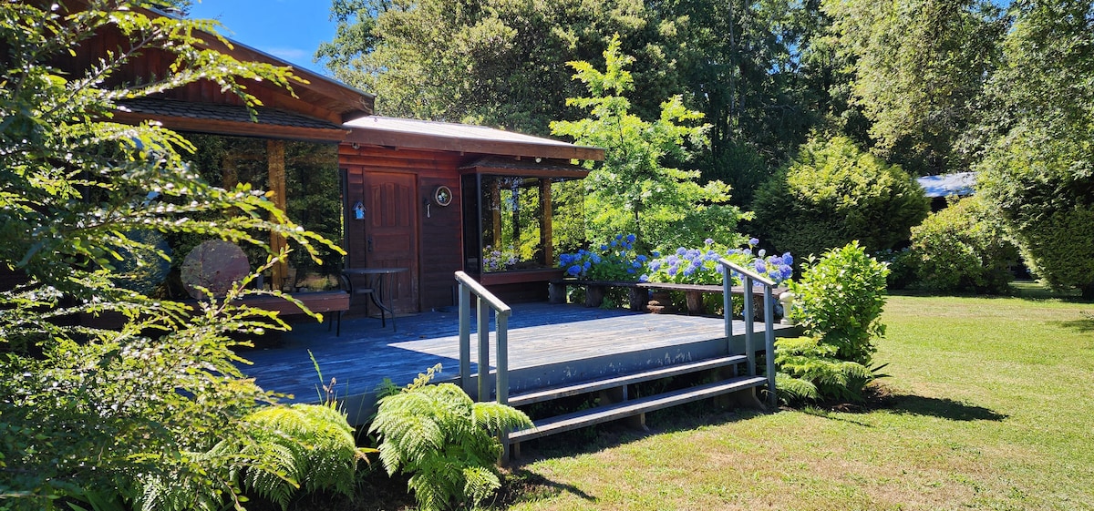 Beautiful Cabin in the Forest, located in the Lefún area between Villarrica and Pucón. It offers a stunning view of Villarrica Volcano, surrounded by native forest and birds. Every day you can hear Loicas and Chucaos. Fully equipped so you can enjoy your stay, disconnect, and relax. A lovely stream runs through the property. We recommend taking nighttime photos of Villarrica Volcano next to the wood stove with the panoramic view our cabin offers. We are sure you will love it!