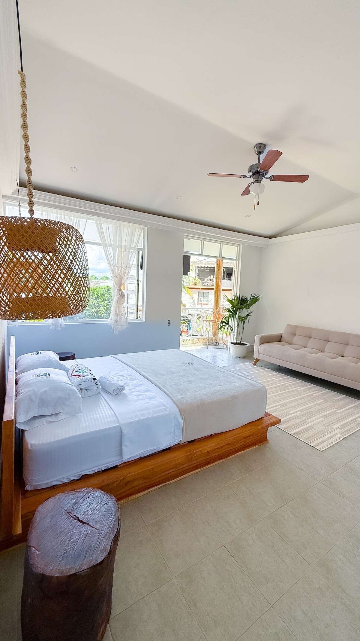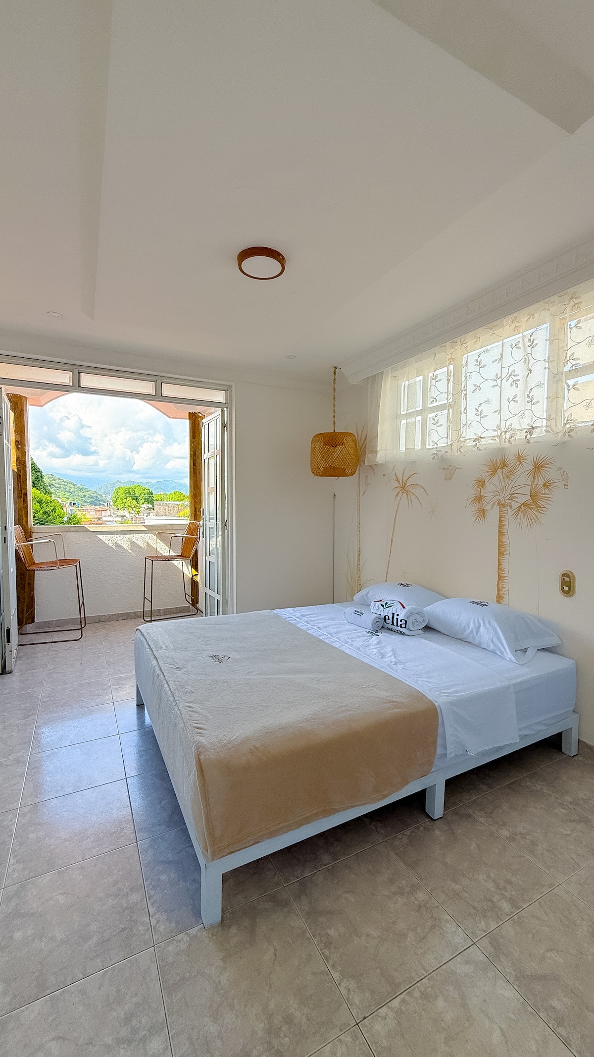 Cómoda habitación con cama doble, sofá cama, baño privado y balcón. Ideal para parejas, acompañantes médicos o viajeros que buscan un espacio tranquilo y funcional. Disfruta de WiFi, acceso a cocina compartida, comedor y sala de TV en un ambiente natural con estilo boho, muy cerca del Hospital Departamental y centros médicos en Villavicencio.