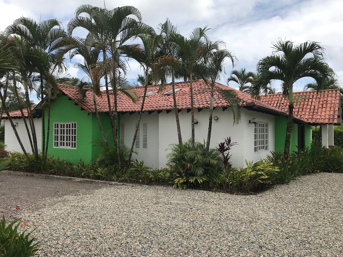 Acogedora casa quinta, ideal para un descanso en familia con camas confortables, baños cómodos, pisos en mármol, internet, televisión satelital, pasillos amplios con hamacas, zonas verdes, zona BBQ, asador y horno de leña, estufa industrial de gas, malla de voleibol, boli rana y parqueaderos. Disfruta del avistamiento de aves silvestres, micos y otras especies fascinantes, un pedazo de cielo para descansar.