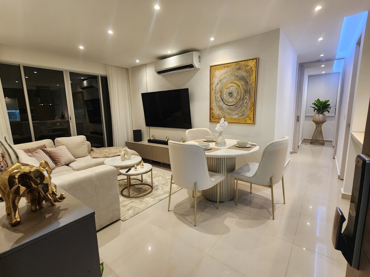 Es una apartamento con una vista espectacular, En el momen hay racionamiento de agua estos son los horarios de 6 a 8 AM y de 5 a 7 pm equipado con lavadora, secadora, nevera, licuadora, lavavajillas, Horno, 3 camas, tocador y juguetes para los niños. También cuenta con 2 televisores Grandes uno de ellos con claro, y wifi en la sala. En el momento está construyendo una torre al lado de nuestro edificio entonces hay sonidos de la obra.