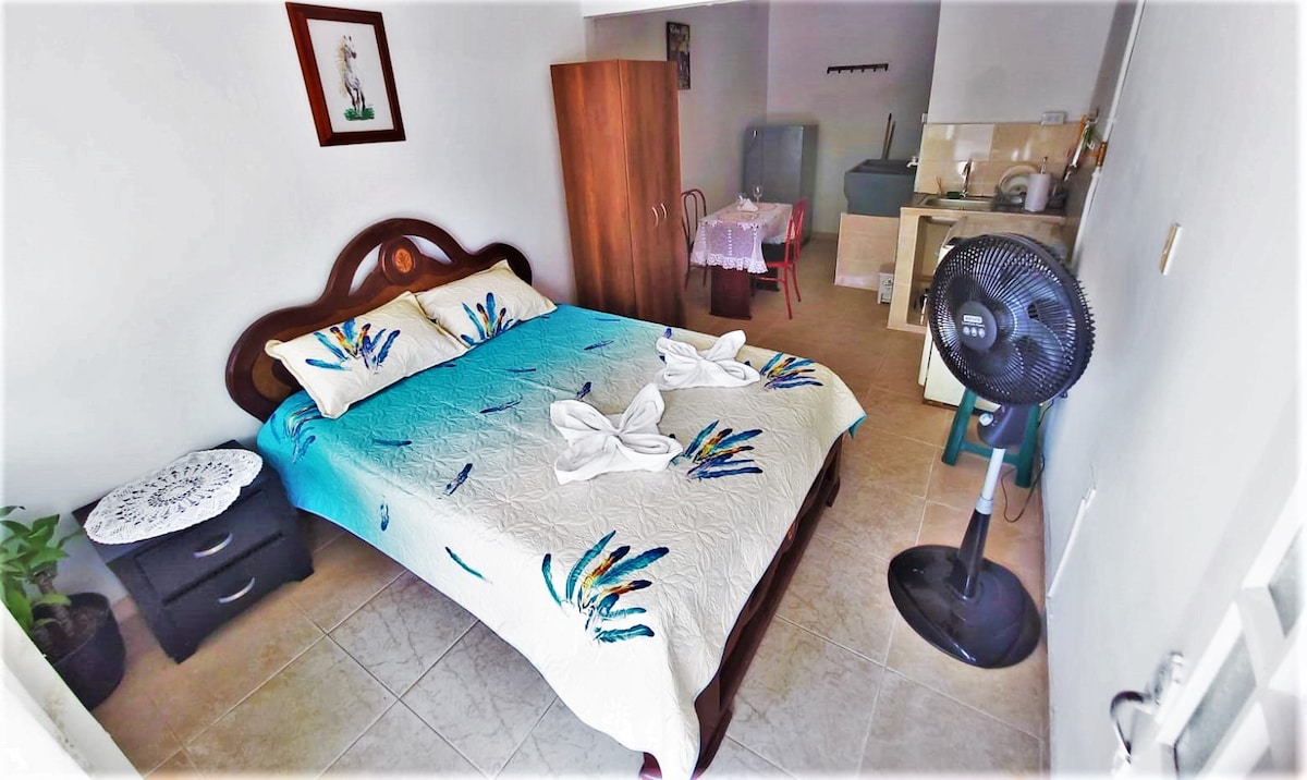 Lugar de descanso apto para dos personas, bien equipado, ideal para estancias largas. !!Ya cuenta con Aire Acondicionado!! Totalmente privado, todo en 1 solo espacio acogedor, con puerta directamente a la calle, fácil acceso. Cuenta Cocina, lavadero, Wifi, nevera, comedor, baño, suministro de agua las 24 horas (Reserva de 2.000L), en fin, lo necesario para una estancia placentera. Nota: Parqueadero gratuito!!