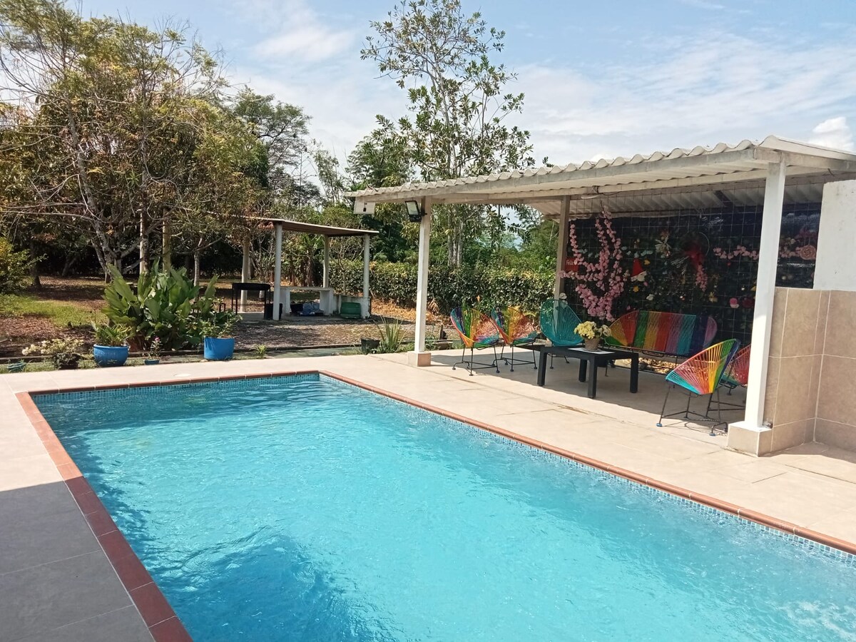 Casa campestre en area rural de Villavicencio , amplia y fresca de 4 alcobas, piscina y bbq . Avistamiento de aves Tenemos bicicletas para hacer bicisenderismo, paseo al rio , bolirana , campo de voley , villar-pie y juegos de mesa. Ubicada en la vereda Araguaney a 8 km de la Unillanos (Vda Barcelona) de los cuales 4 km pavimentados y 4 km despavimentado, pero carreteables , puede entrar autos pequeños.