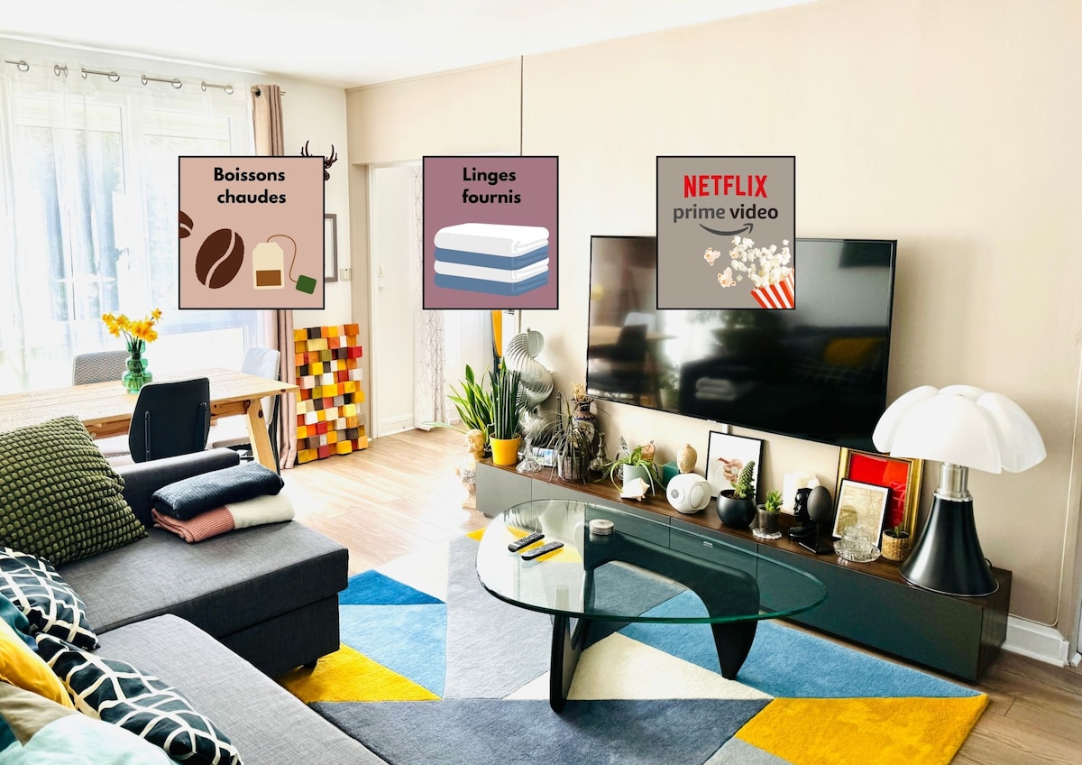 Bienvenue dans ce spacieux 2 pièces de 52m2 où tout est pensé pour votre confort! Literie et serviettes en 100% coton pour un confort optimal Canapé convertible 2 places ( 140x200) dans le salon Grand lit double (160x200) pour des nuits reposantes Un lit parapluie pour bébé à disposition Gel douche et shampoing 95% produits naturels fournis Cuisine entièrement aménagée et équipée Parking sur place (gratuit) Laissez-vous séduire par ce cocon pratique et accueillant aux portes de Paris !