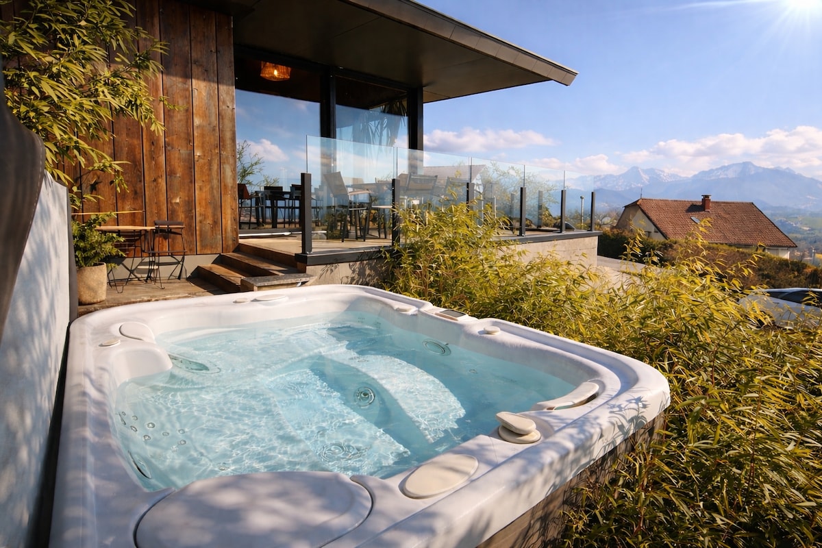 Ce splendide studio en bois, perché au-dessus de Genève vous offre une unique vue sur le bassin genevois, le lac et son jet. Tout confort, vous bénéficierez d'une entrée personnelle pour votre voiture ainsi que d'une place de parking privée. Vous aurez accès à la piscine , Ophélie & Nicolas vous proposent en plus le sauna maison. En pleine nature, à quelques minutes du centre de Genève! Détendez-vous dans ce logement unique. Vélos électriques à disposition et le centre de Genève à 15 minutes