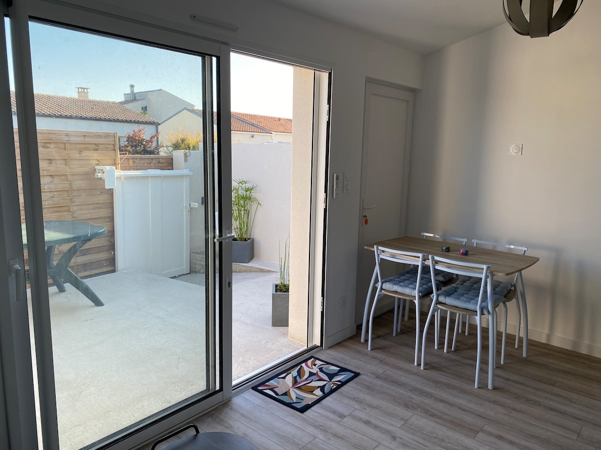Venez vous reposer dans ce logement cosy avec patio privatif, proche de l’océan avec de magnifiques sunset. Situé à 15’ de La Rochelle et 20’ du pont de l’île de Ré. Retrouvez tout votre confort avec une cuisine équipée : micro ondes, plaque induction, machine à café, bouilloire… Une salle d’eau avec linge et sèche cheveux fournis Reposez-vous dans un lit queen size 160 cm avec un matelas d’hôtel (draps fournis) avec dressing. TV équipée Chromecast et Netflix, wifi gratuit.