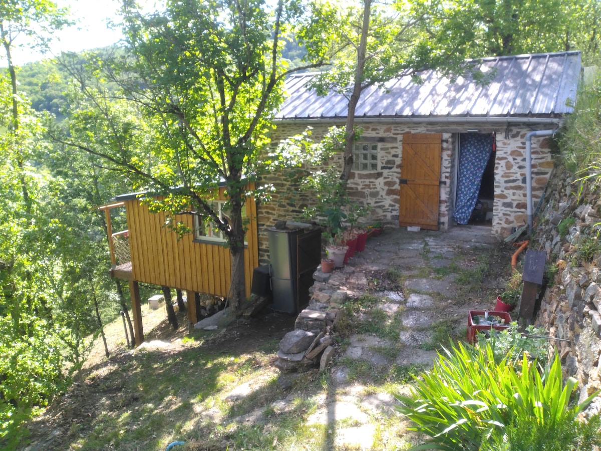 Maison dans la forêt, isolée sur un coteau au dessus du village. Équipée avec tout le confort nécessaire. C'est ma maison à l'année. À l'entrée un wc et une pièce faisant office de stockage et de bureau. Elle donne sur une extension lumineuse avec un grand salon, une cuisine et une salle de bain équipée d'une douche. Le balcon ouvre sur la forêt où l'on côtoie la cime des arbres. À l'étage une grande chambre avec baignoire et lit king size. Terrain accidenté qui ne convient pas aux enfants.