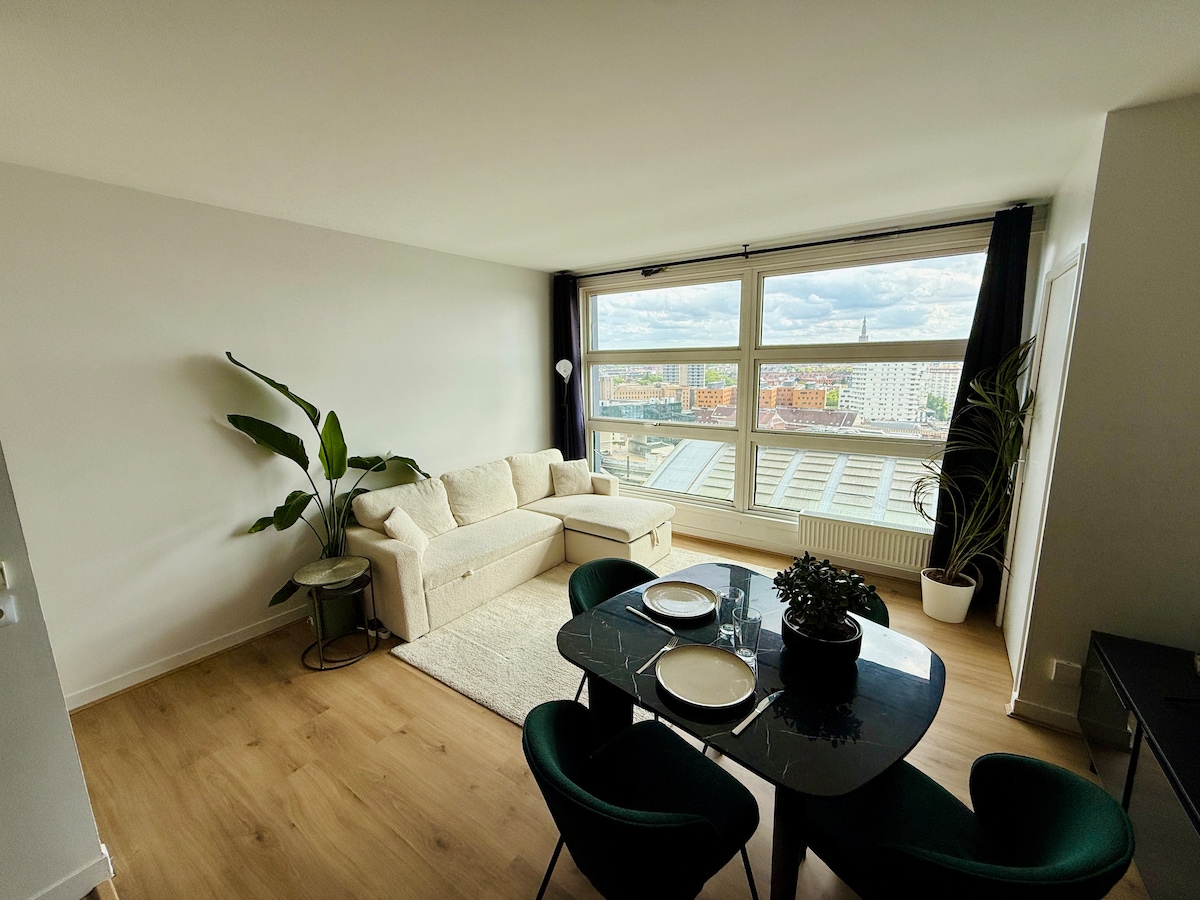 Appartement avec vue exceptionnelle – 16e étage, cœur de Lille Situé au 16e étage, cet appartement rare offre une vue panoramique imprenable sur tout Lille. En plein centre-ville, vous profiterez d’un emplacement idéal, tout en étant au calme absolu, loin du bruit. Au pied des gares Lille Flandre et Lille Europe, l'appartement peut accueillir jusqu'à 4 voyageurs grâce à un lit double et un canapé convertible.