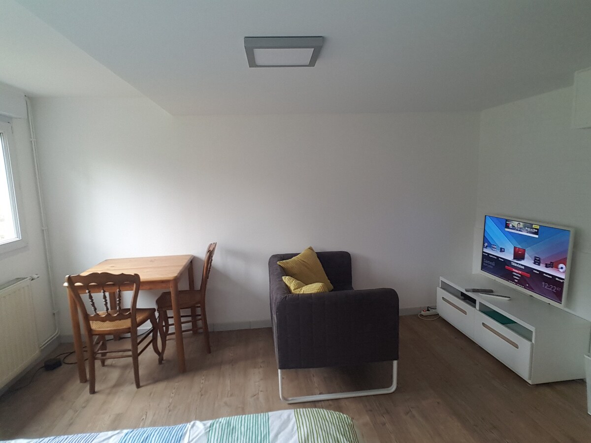 Quiet and spacious apartment on the ground floor of the house, overlooking garden, with bed 1,40x2m, TV, kitchen, bathroom, separate toilet, storage. -Decathlon Arena stadium 30 minutes walk. -metro 4 Cantons 5 minutes by car (free guarded parking), 25 minutes walk. -scientific city and Haute Borne 15 minutes walk. Shops, restaurants, bars, pharmacy, gas station, public transport within 500m. ATTENTION! Ceiling height of 2m in places.
