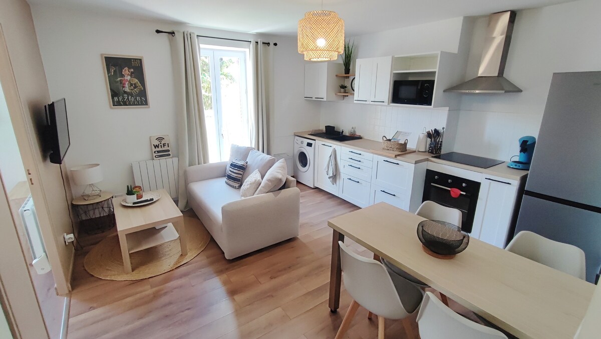 Profitez d'un logement élégant et central face aux Halles de Béziers, élues "plus beau marché de France 2025". Cet appartement de deux pièces climatisé et décoré par une architecte d'intérieur se trouve au deuxième étage. La chambre est au calme et le séjour dispose d' un canapé convertible et de WC séparés. De plus, rénové en 2025, cet appartement est écologique et classé A+. Ce logement n’est pas adapté aux personnes à mobilité réduite.