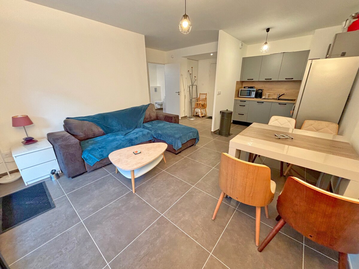 Magnifique studio entièrement rénové, dans résidence de vacance sécurisé,caméra,gardien de nuit, avec piscine, jardin d'enfants,tennis, ping pong. Situé à proximité de nombreux commerces et restaurants,d un grand centre commercial,proches aéroport de Nice et du port de Saint-Laurent du Var.A quelques pas de la Mer le studio se compose d'un lit double escamotable et de 2 lits superposé,d une grande terrasse, cuisine équipée, TV avec chaîne international Wi-Fi et laverie automatique.