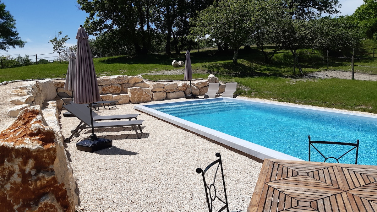 Cette agréable maisonnette très "cosy" en pierre fait partie d'un domaine de 19 ha comportant plusieurs gîtes, sa localisation isolée vous offrira une intimité appréciable. Ses deux terrasses offrent une vue imprenable sur la vallée de la Masse et la campagne vallonnée à perte de vue ! Une grande piscine partagée et sécurisée de 6x12 m vous attend lors des chaudes journées d'été. Elle est située à 100 m de la maisonnette.