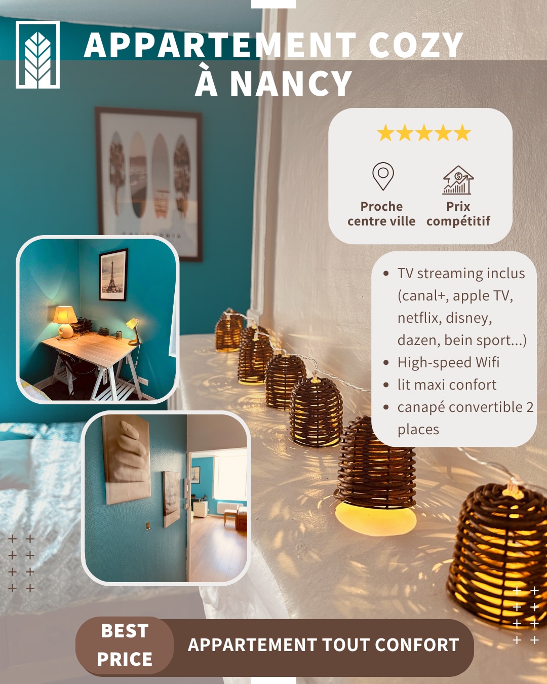 Appartement avec chambre, climatisation et totalement équipé. 3éme étage. Rue du Sergent Blandan, 2 minutes de marche du campus Artem et de Nancy thermal. Proche bus, commerces … Bread and Coffee à proximité pour le petit-déjeuner Détecteur de bruit anti fêtes Caméras de surveillance de l’entrée à l’extérieur Stationnement payant dans la rue du lundi au samedi, 5 euros par jour. gratuit les dimanches et jours fériés. Application Easypark