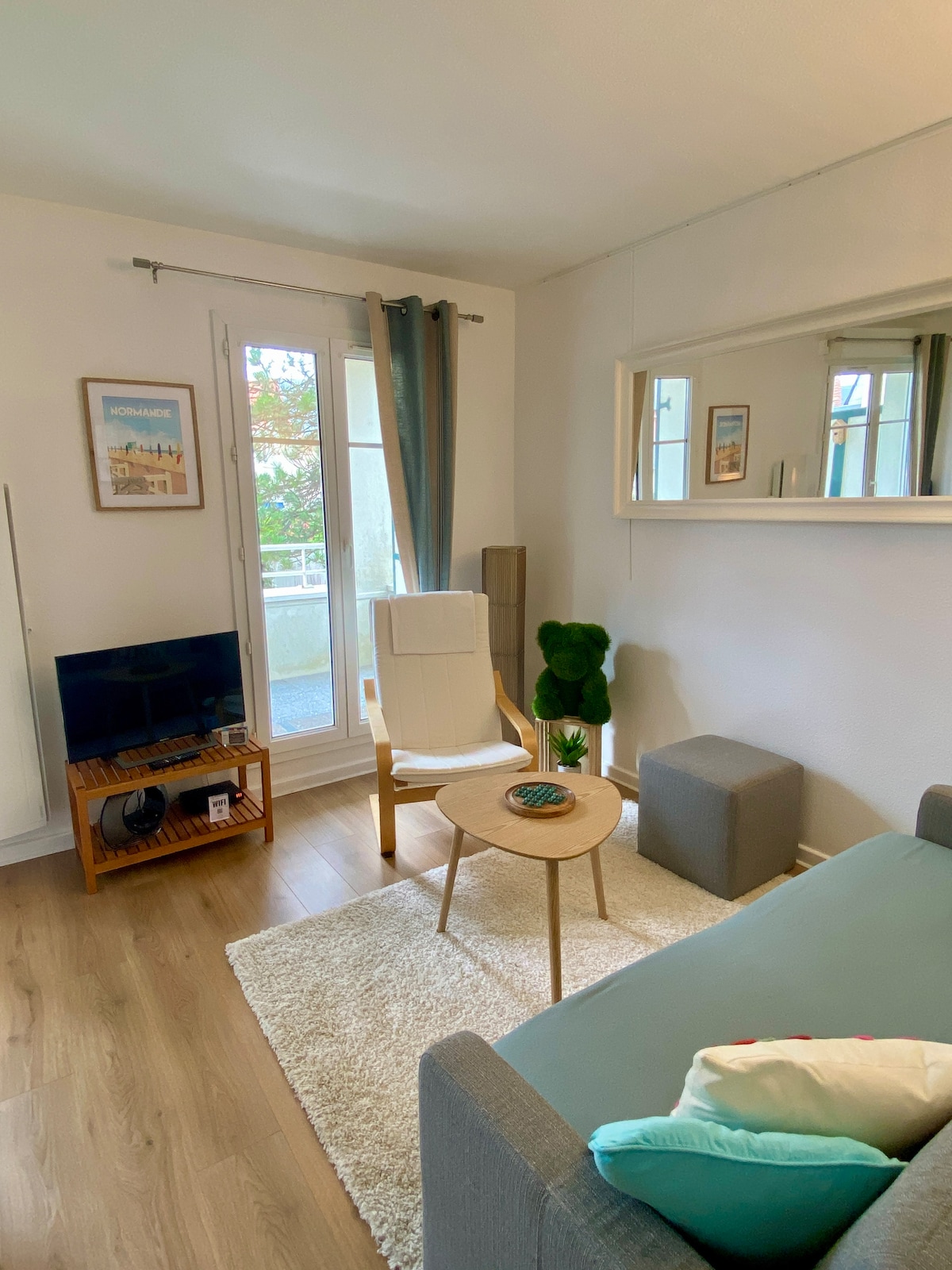 Beautiful apartment of 50m ², bright, quiet and warm, nestled in a luxury residence, on the heights of Villers sur Mer, 15 minutes walk from the beach and the city center. Do not hesitate to stroll through the city market on Tuesdays and Fridays and discover the tasty local "Teurgoule". Without going too far, you will find in the city center many restaurants, shops and services.