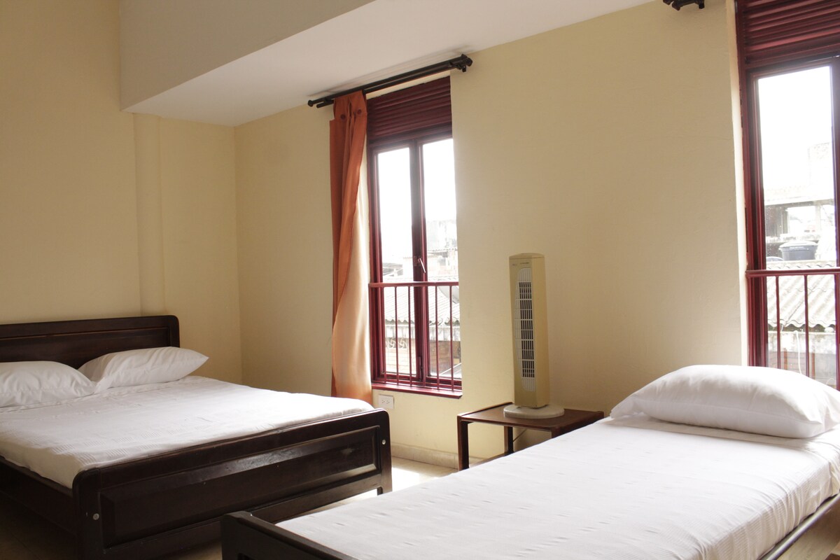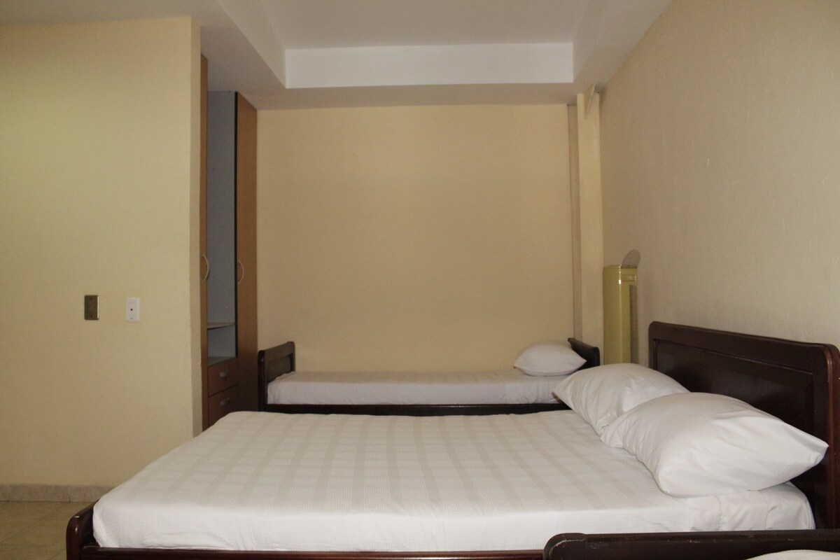 El apto consta de un habitación con una cama doble y tres sencillas, TV con mueble escritorio, Ventilador, cocineta eléctrica de dos puestos, juego de comedor de cuatro puestos. El edificio cuenta con un elegante café bar y está localizado a media cuadra del parque principal donde encuentra restaurantes, heladerías, pizzerías, bares y discotecas.