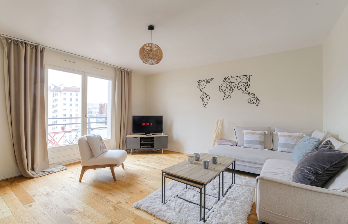 ✨Venez profitez d'un logement élégant et central de 45m2 idéalement situé à 1 minute à pied de l’arrêt de métro Gratte-ciel ✨ Cet appartement refait à neuf et complètement équipé saura vous séduire. À proximité d'un arrêt de métro permettant d'aller à La Part Dieu en 20mi, à Bellecour en 15 min, au Groupama Stadium en 20 min et en moins de 30 min de l’aéroport avec des navettes directes ! Ambiance détente avec Netflix inclus pour un séjour confortable, c’est la promesse que nous vous faisons !