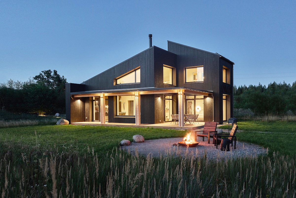 Exceptional romantic TOTALLY PRIVATE with no neighbors studio type holiday house with a view at the river, forest and meadows. River House is located at the eco farm with old Lithuanian breed horses and Angus cows. There are no neighbors around. River is with a footbridge. There is a full equipped kitchen, WiFi, projector with a screen, conditioning system air to air and a wood stove 🔥 House at River has it's own private hot tube electric, preparation time 6 h, price 80 eur.