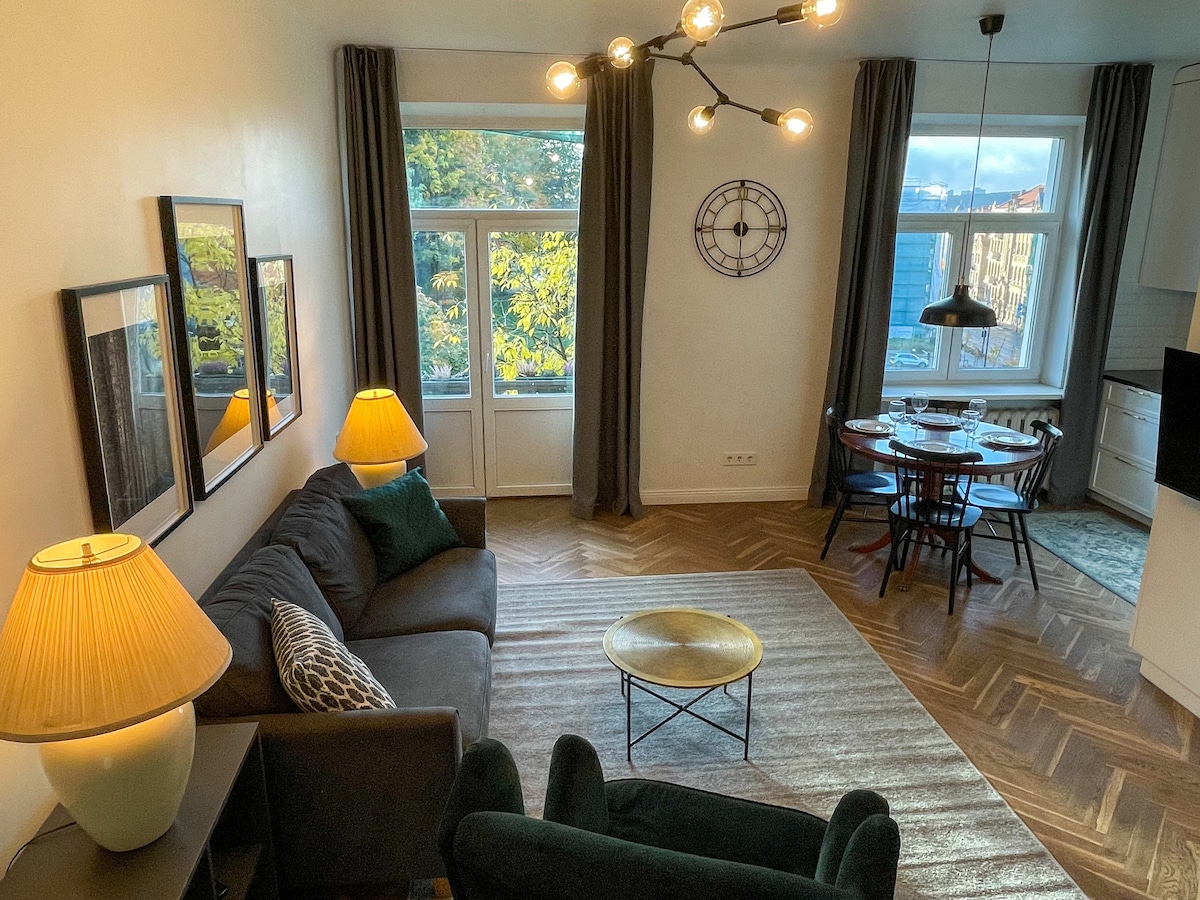 Apartment is bright, furnished with finely combined classic and modern styles. 3.5 metre high ceilings & a lovely balcony. Historic building of the 19th century, fully renovated in 2011, preserving its' old stunning facade & staircase.