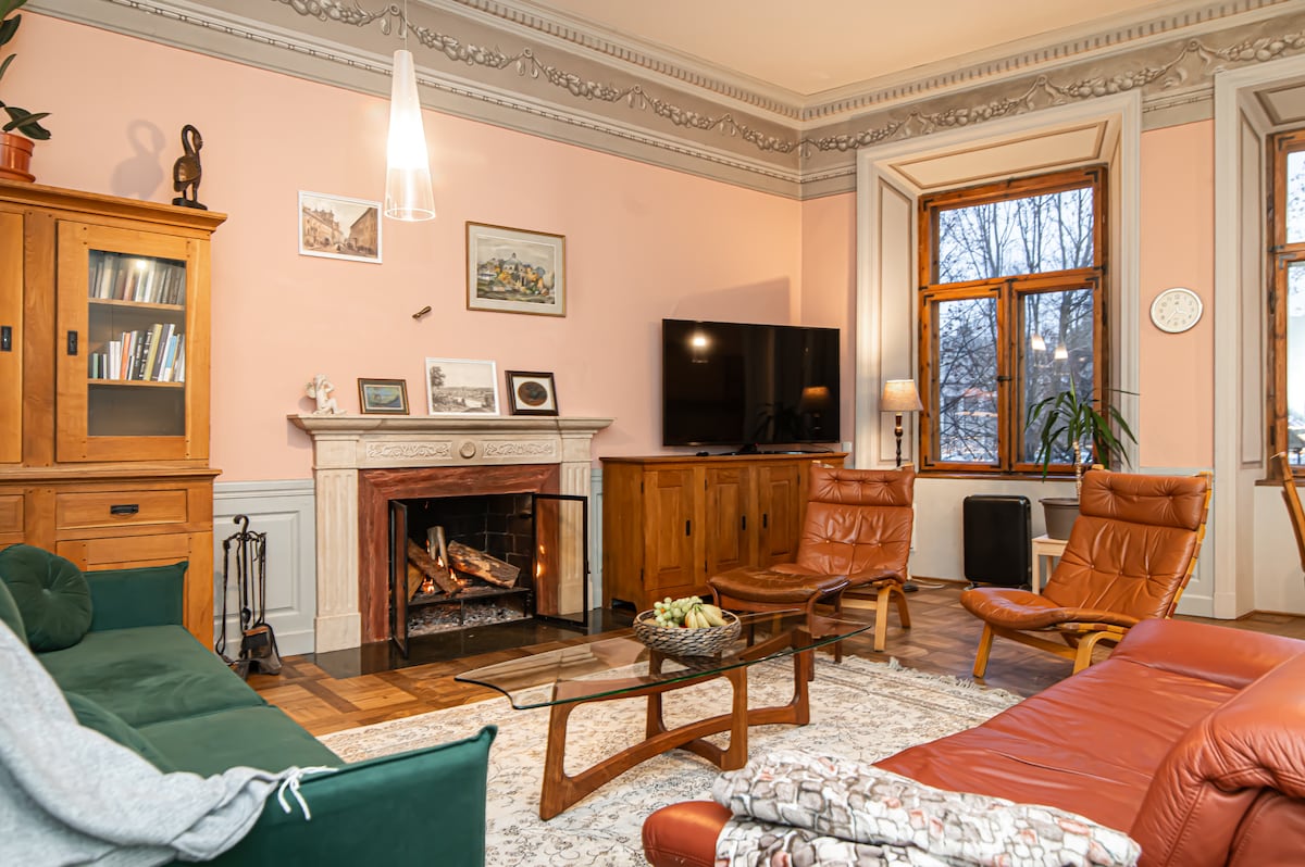 Spacious, very cozy, stylish, fully furnished apartment with a large fireplace in the living room, balcony, kitchen island, large carpet. The loft-type living room layout. Away from the hustle and bustle is the bedroom and a very spacious bathroom, where you will find cozy corner for quiet thoughts or book reading. For your convenience - two bathrooms. Central location of the apartment is safe and appreciated by our guests. For stays longer than 14 days parking in a closed courtyard is included.
