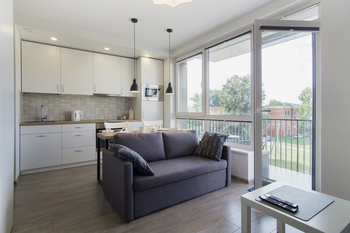 Paupys neighborhood is a new fashionable neighborhood is historic Old town of Vilnius. Here you can find a wide variety of cafes, shops, Paupys food court, a cinema and modern architecture residential houses.This cozy 24 sq.m. apartment offers a living room, all the necessary features, comfy couch which transforms into a bed, equipped kitchen, a bedroom and a balcony. Only paid street parking: I-VI 8-22, 1h - 2,5 Eur.