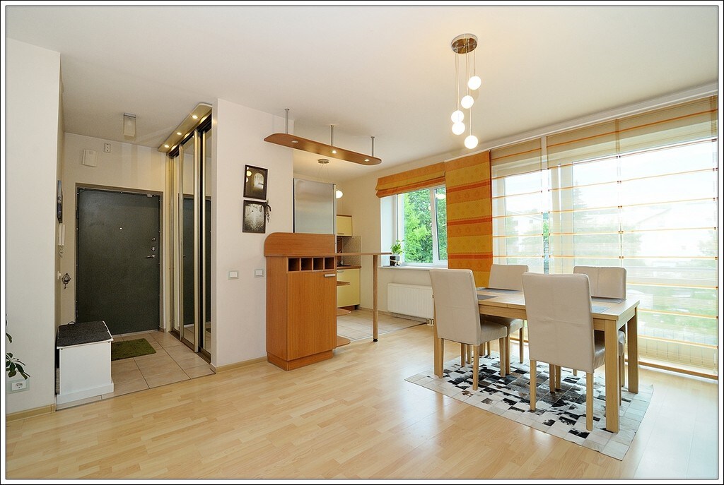 The stylish-modern 1 bedroom (2 rooms) apartment (total size ~35 m2 ) with views to the open area through the big windows. The apartment is quiet, very light and a brand new with dominating of the natural wood around. The Apartment is on the South - West entrance to Vilnius Old Town. The Central Square you can get within 15-20 min by the nice walk through the small streets of Vilnius Old City . The Bus station is ~300m, the Train station is ~500m, the Airport is just ~3 km.