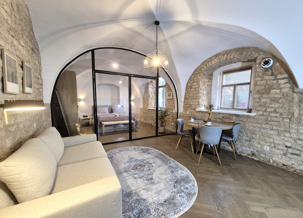 St. Ignatius apartment in the 17th century Monastery. The apartment is settled in the Benedictines Convent that reaches XVII century and are national heritage monument protected by government. It is the place for those who want to feel the mystery of the old town, for those who adore living and walking between tiny old towns streets, for those who are looking for something new in the old. The interior design is luxurious, cosy and unique with the saved shapes and parts of old monastery.