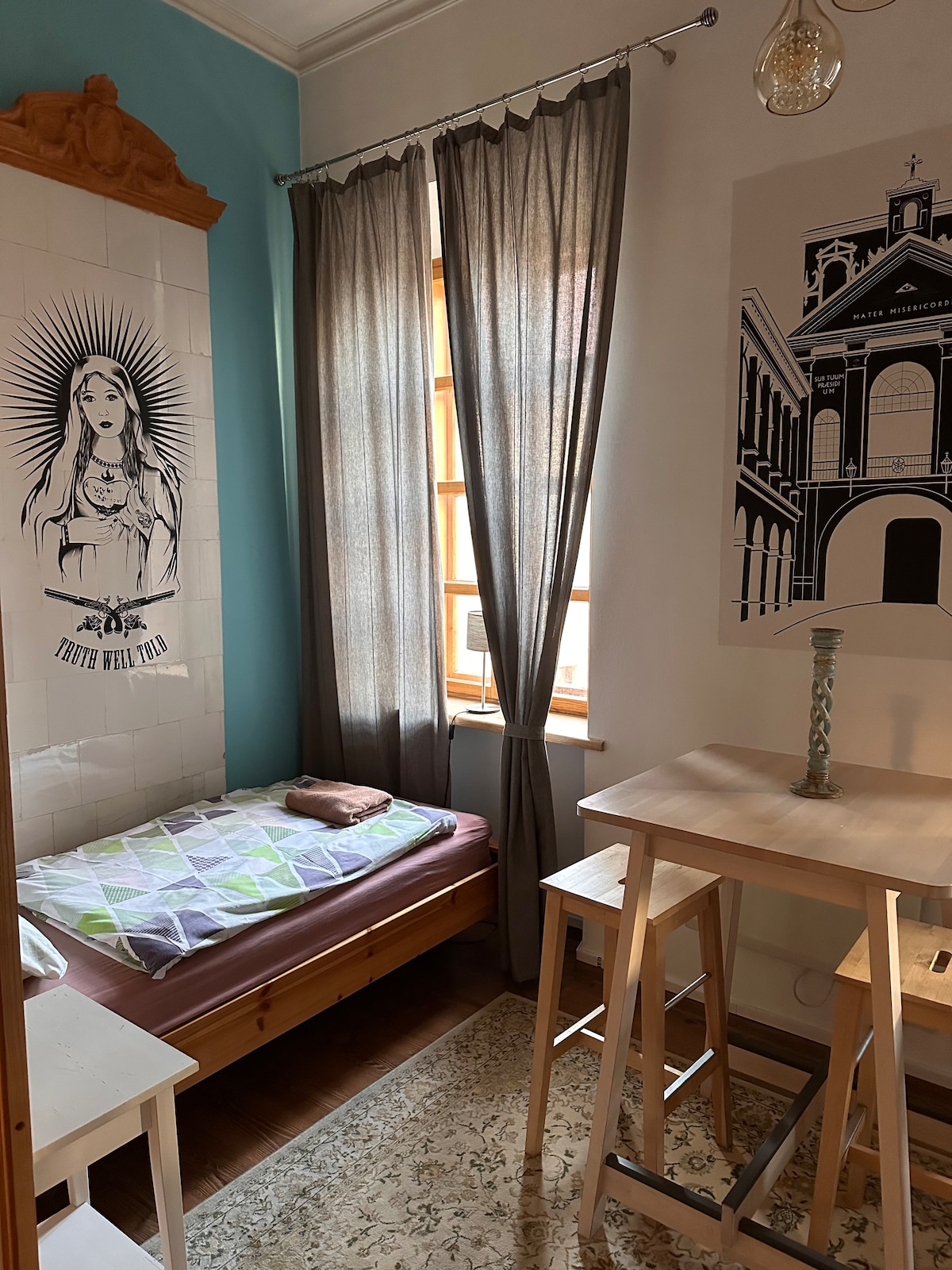We are a small hostel, which, we believe, is a perfect for keeping our homely atmosphere. Located in the very center of Vilnius, you're a 5 min walk to everything. We have private and shared rooms. The price is for a bed in 4-bed mixed domitory room. Wi-Fi, towels and bedding is included to the price.