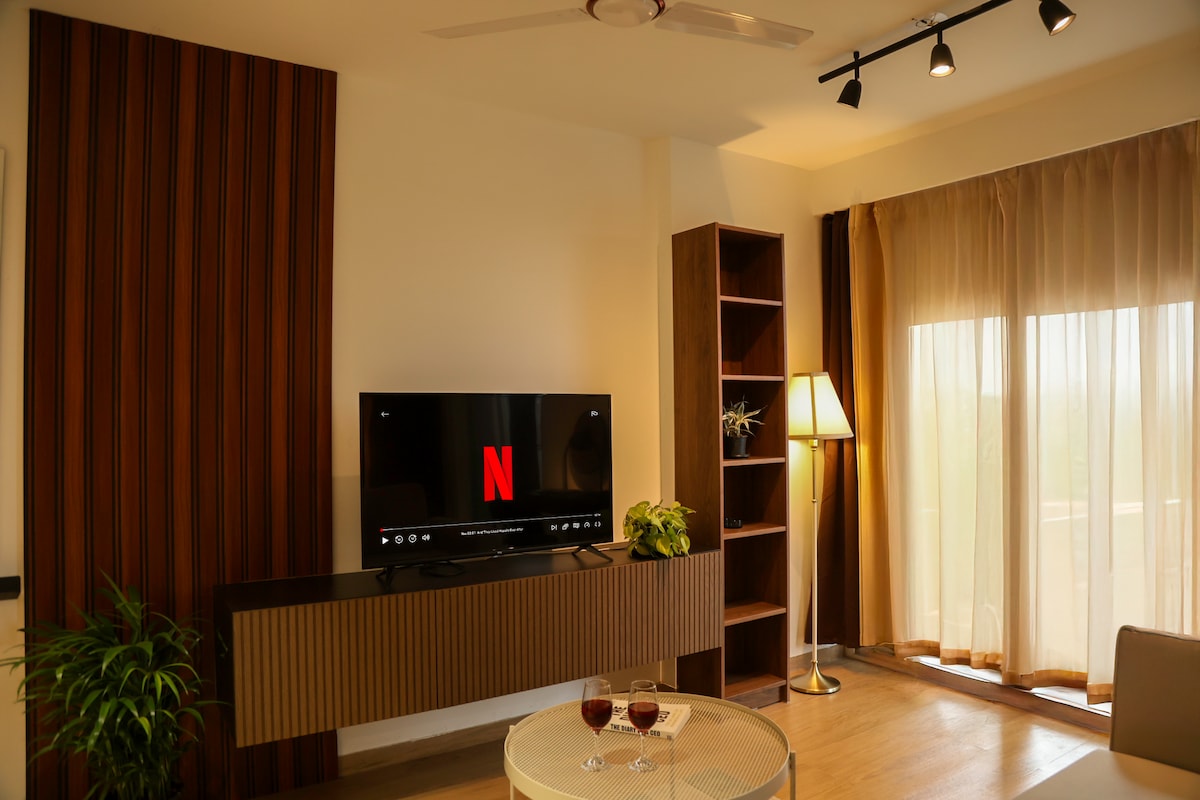 This place is luxurious 1 BHK couple friendly offers modern aesthetics & fully loaded apartment, making it one of the best in Kharadi, Pune. Located just a 5-minute walk from EON IT Park, Barclays, Citi, British Petroleum, & with Magarpatta & Pune International Airpot only 7 km away, it's in a prime spot near cafes, restaurants, shops, public & private transport in Kharadi. Living area features a cozy sofa & Apple TV with OTP channels , Bar unit perfect for relaxing after a day of exploring
