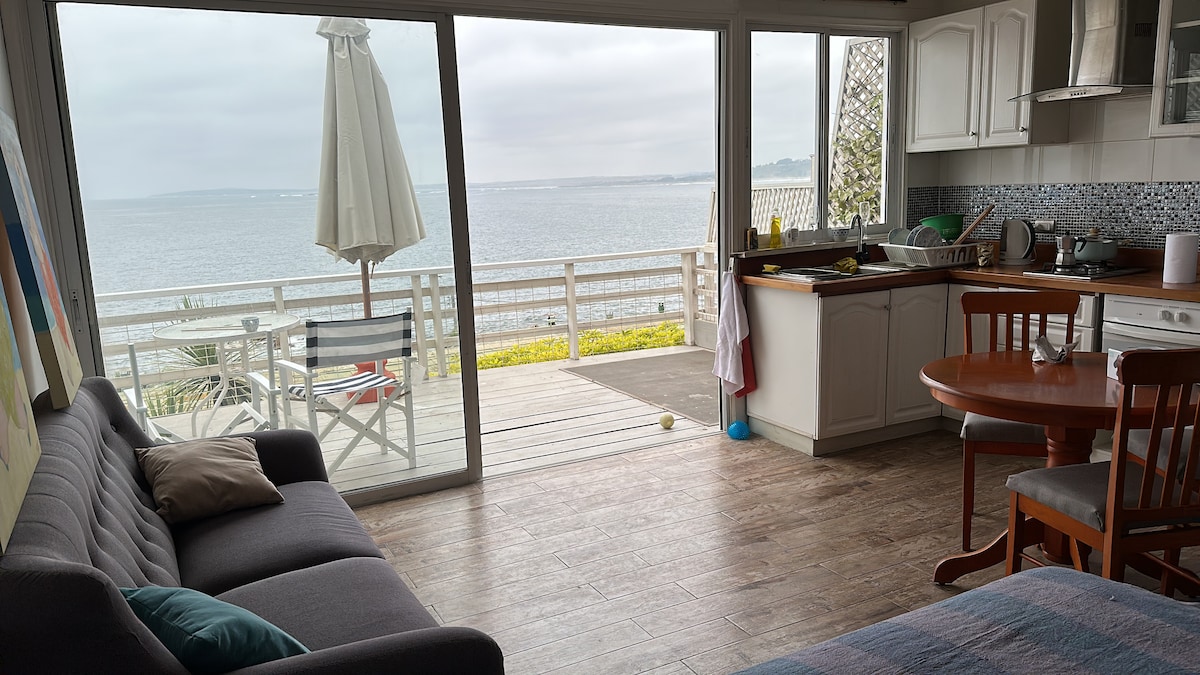 Alojamiento excepcional en Concón. Pequeño bungalow de un ambiente con inmejorable vista al mar. Parte de un condominio de los años 60, muy tranquilo y familiar, que cuenta con bellos jardines con flores, piscina y espacios de uso común. El bungalow está renovado y completamente equipado. Cercano a la playa Amarilla (10 minutos a pie) y la playa la Boca, restaurantes y comercio. Ubicación inmejorable. Cuenta con una cama matrimonial, y una cama nido.