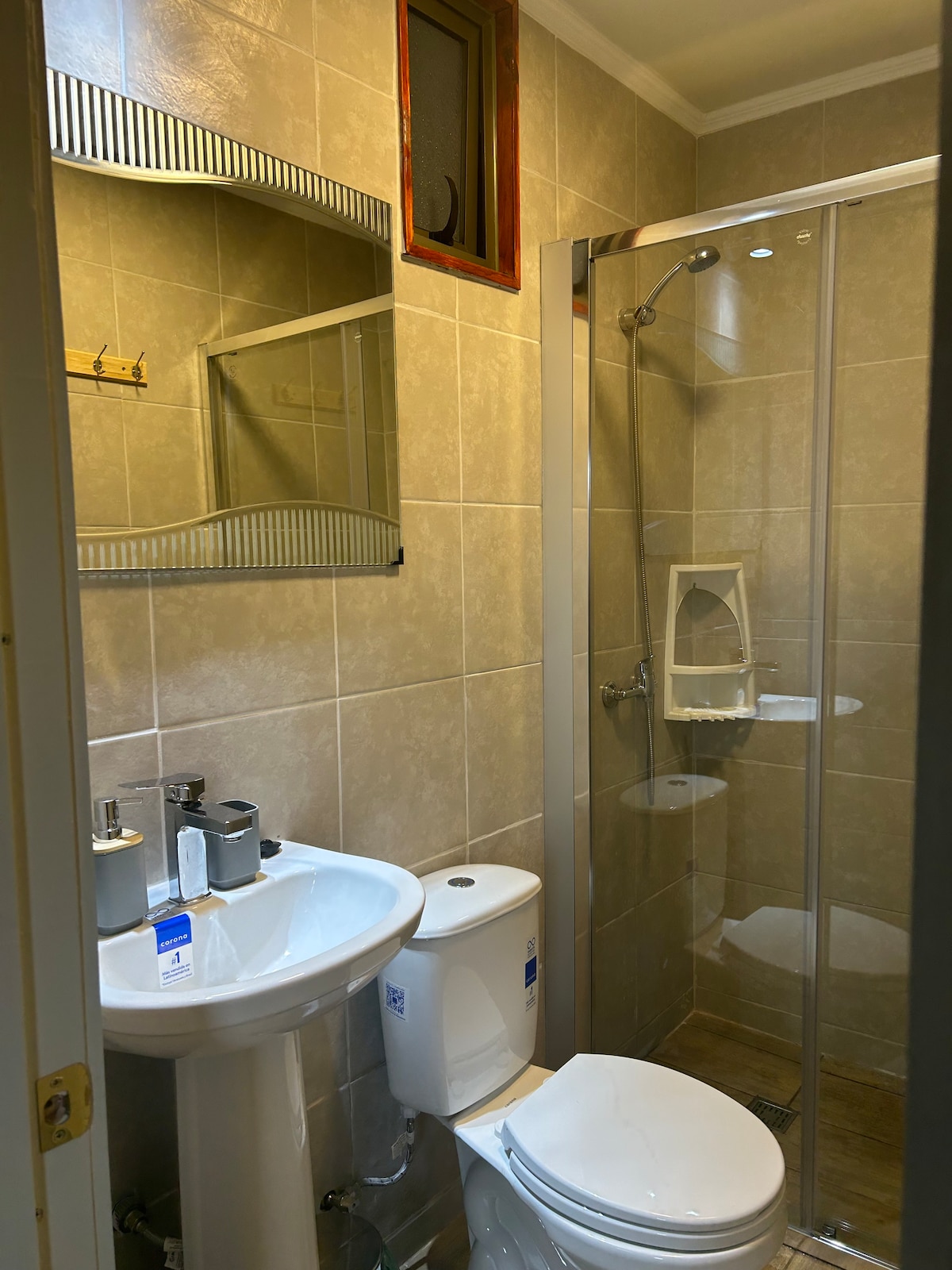 Habitación con cama matrimonial, baño privado y cocina privada, ventana con luz solar, wifi y agua caliente. Supermercados y locomoción muy cerca. Estacionamiento afuera de la propiedad. IMPORTANTE: por seguridad, NO se aceptan personas fuera de las indicadas al momento de la reserva, o diferentes de las que ingresaron el primer día.
