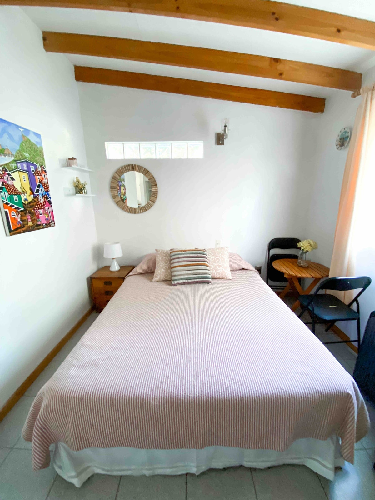 Habitación con cama matrimonial, baño privado y cocina privada, ventana con luz solar, wifi y agua caliente. Supermercados y locomoción muy cerca. Estacionamiento afuera de la propiedad. IMPORTANTE: por seguridad, NO se aceptan personas fuera de las indicadas al momento de la reserva, o diferentes de las que ingresaron el primer día.