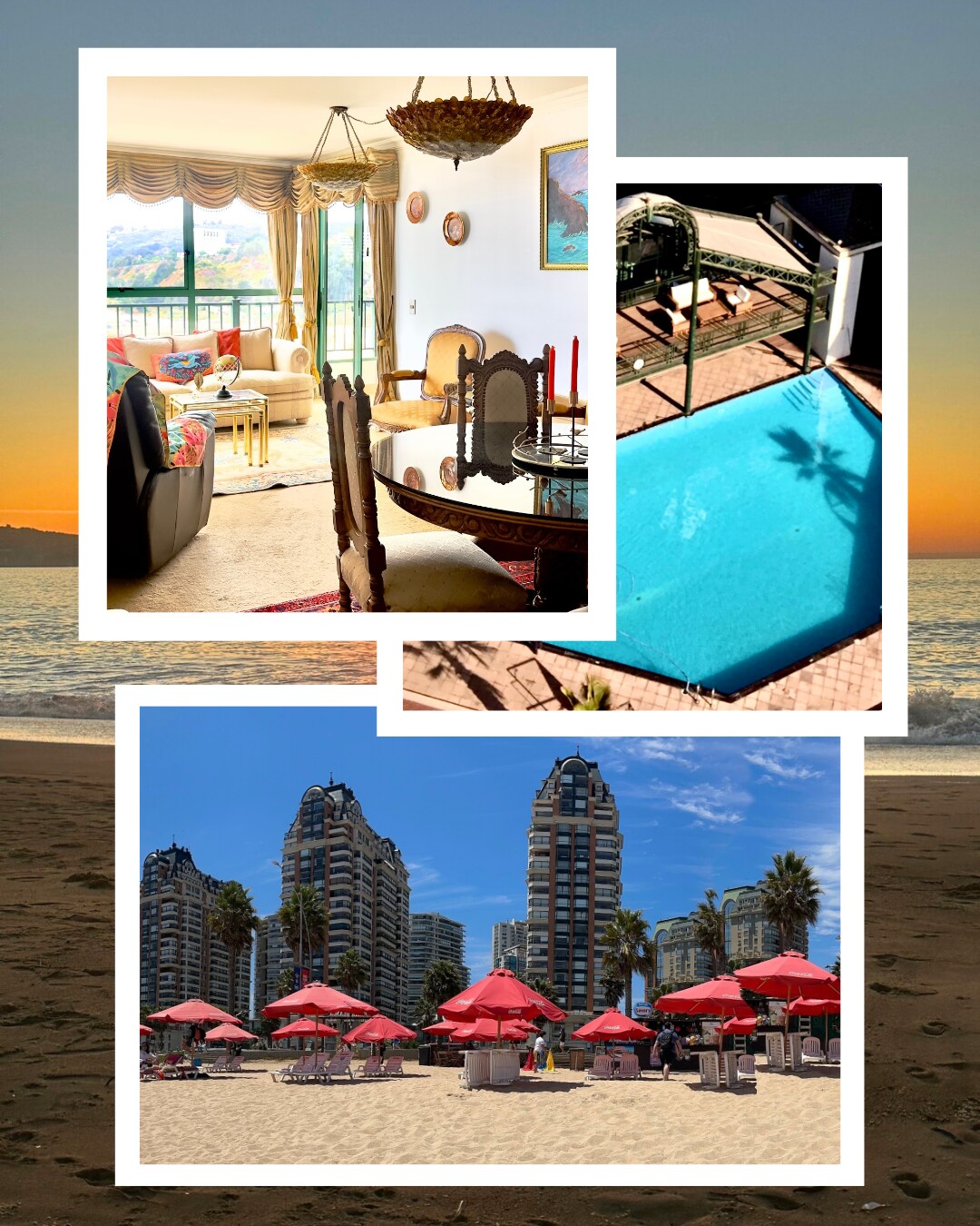 Departamento exclusivo en primera línea frente al mar, con terraza privada y vista panorámica a toda la bahía de Viña del Mar. Amplio y cómodo, ideal para familias o grupos que buscan espacio, privacidad y una ubicación privilegiada: cruzas la calle y estás en la playa. Cuenta con 4 dormitorios, tres con camas de dos plazas nuevas, un dormitorio con sofá cama, y un sofá cama adicional en la sala de estar. Dispone de 3 baños con ducha, cocina totalmente equipada y estacionamiento privado.