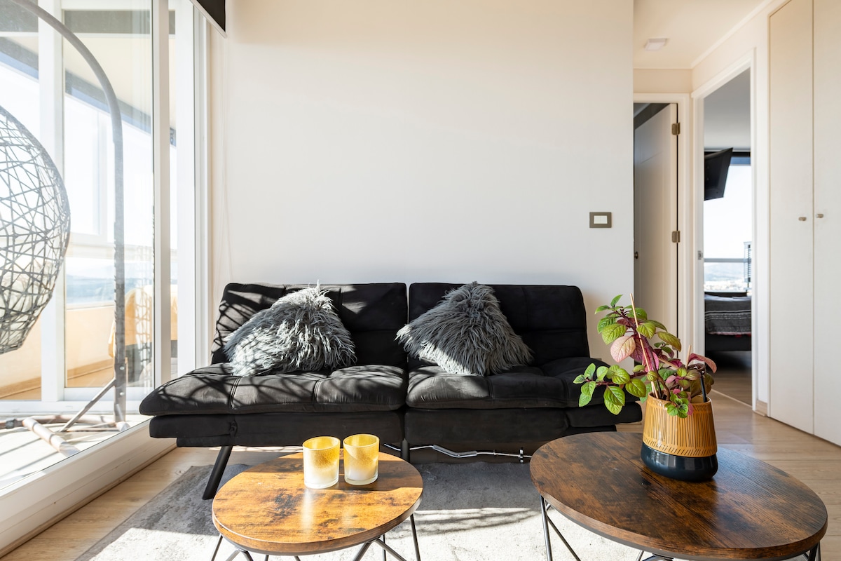 Ideal apartment to relax, telework, rest and spend an unforgettable vacation. Fully equipped for 6. Pet friendly. Two en-suite bedrooms, each with a queen bed and full bathroom. A comfortable double sofa bed in the living room. From any point you can enjoy an unbeatable panoramic view. Private parking at -1. 7 minutes from Reñaca beach, 20 minutes from Vaplaraíso, 1 hour from Maitencillo, 1 hour from Casablanca (capital of vineyards), 2 hours from Santiago.
