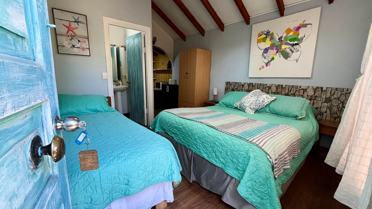 Relájate en esta escapada única y tranquila! La cabañita es de dos piso.En el primer piso, se encuentra dormitorio, baño y cocina americana y en segundo piso,salita de estar.En frente hay una plaza muy hermosa.Cuenta con tv.cable y wifi.A pasos puedes encontrar todo tipo de servicios desde supermercados, bancos, farmacias y una gran variedad de restoranes, pub con música en vivo.También puedes bajar caminando al borde costero donde puedes visitar las distintas playas del sector.