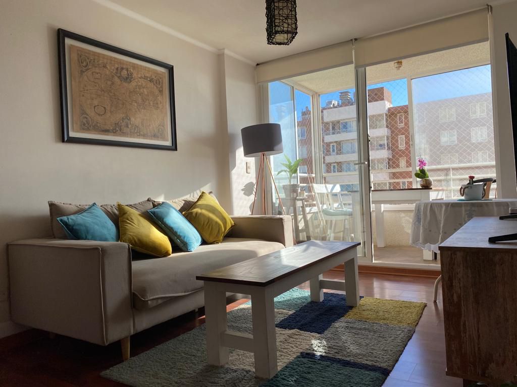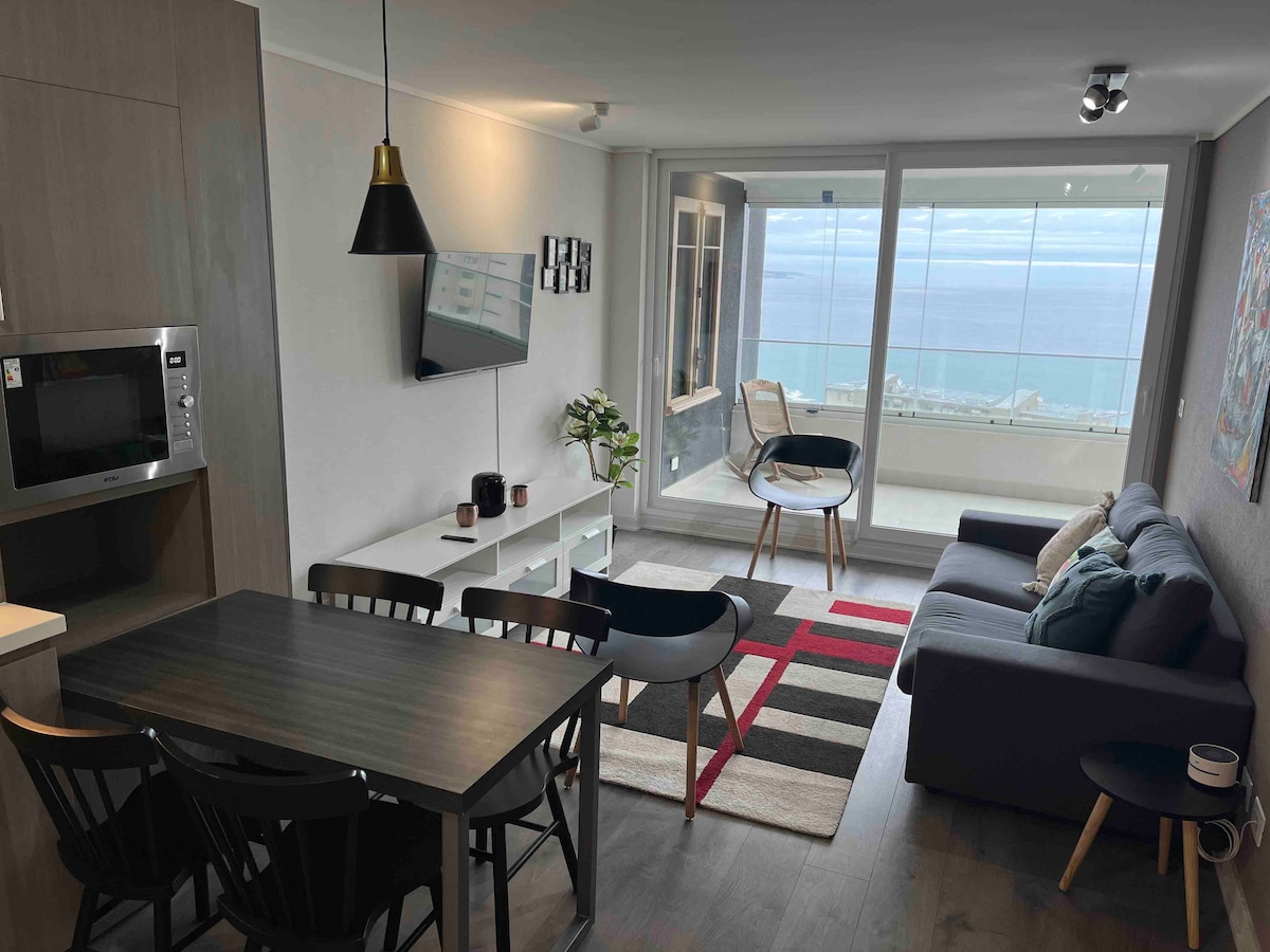 Disfruta de la comodidad de un Departamento Nuevo justo frente a Las Dunas de Concón. Con amenidades para disfrutar del atardecer en terraza con vista panorámica. Cercano a supermercados, farmacias, restaurantes, bares y cafeterías. A 10 minutos de Playa Reñaca y Playa Amarilla. A 5 minutos de la Roca Oceánica. Cuenta con cocina full equipada, cama súper king, sofá cama, colchón autoinflable y Smart TV con servicios de streaming habilitados. Condominio con piscina, quinchos y gimnasio.