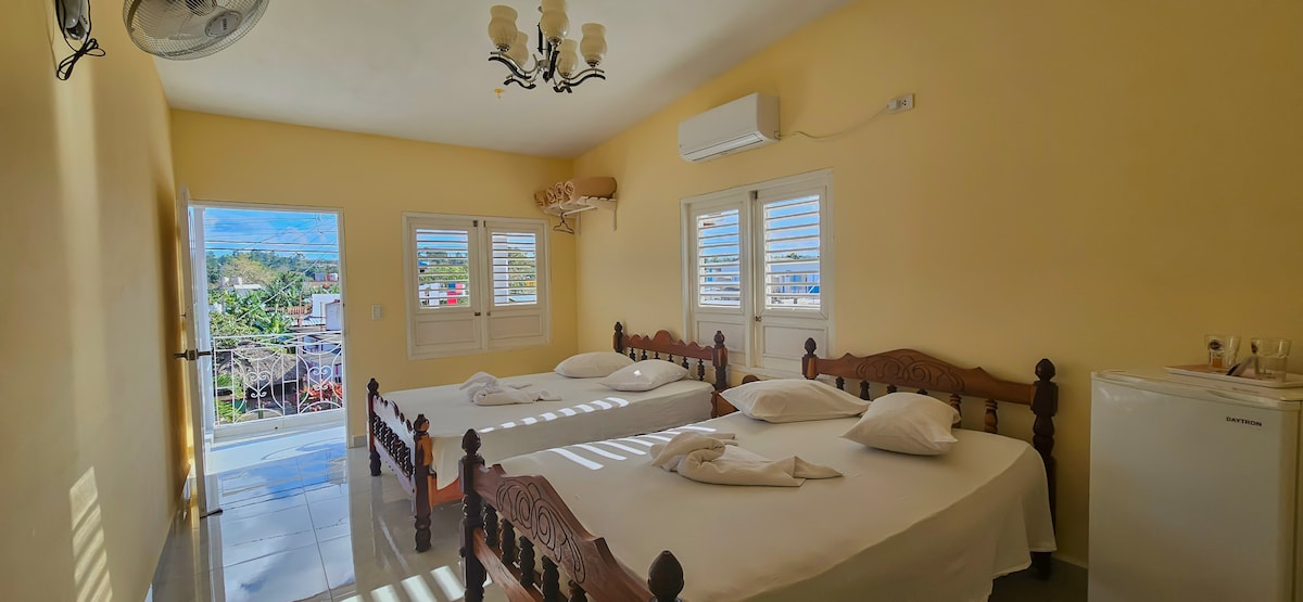 Alojamiento independiente con terraza y vistas increíbles al atardecer sobre las montañas de Viñales. Capacidad para 4 personas con 2 camas matrimoniales, baño privado, aire acondicionado y cocina americana. Ademas del servicio Wi-Fi libre de costo, cuenta con generador eléctrico para cortes de luz, ventilador y luz recargable. Ubicada cerca del centro del pueblo y de rutas naturales. Ideal para familias o amigos que buscan privacidad, comodidad y una experiencia auténtica.