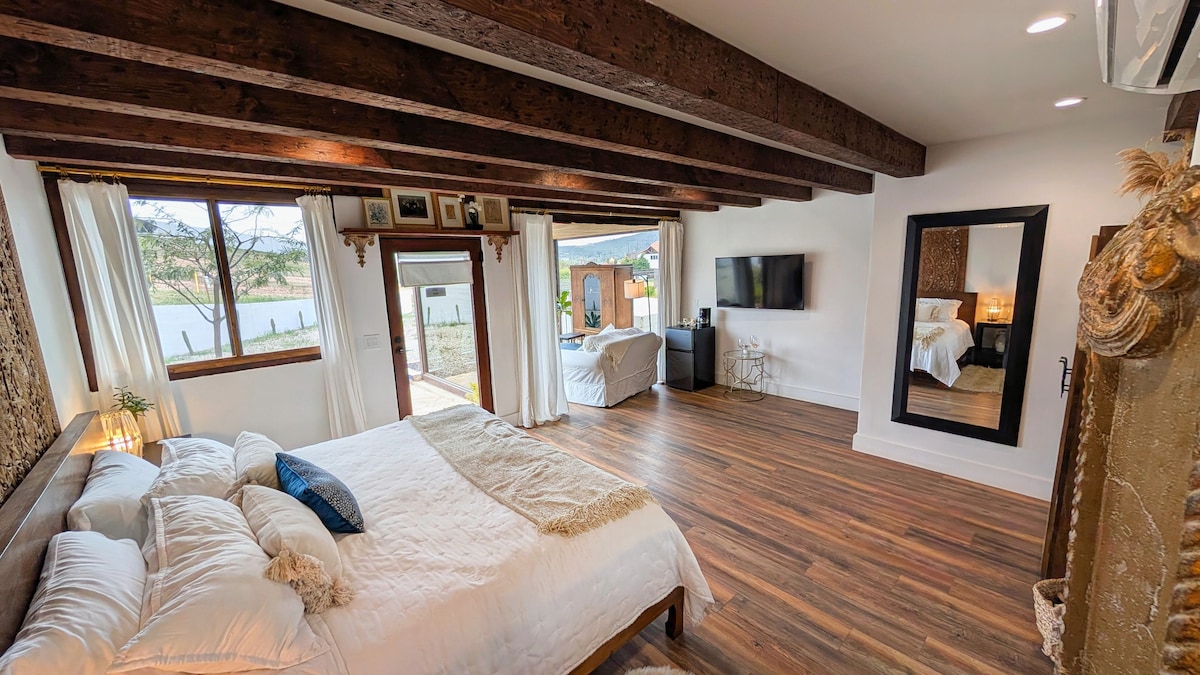 Just a few minutes away wineries in the middle of San Marcos. You’ll enjoy a quiet morning on the ranch with spectacular sunsets and a cozy bed to sleep in. Blackout curtains keep the mornings at bay while you enjoy coffee in bed or take a stroll across the property. Stay the week and see more of Valle de Guadalupe wine valley; work here doing the week or weekend, with a standing desk second monitor and docking station.