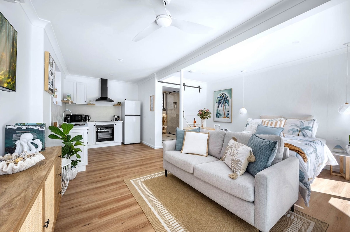 Cosy beachside couples getaway. I’m awash with sun-kissed rooms and nestled in a playful seaside town, lapped by the white sandy beaches of Jervis Bay. Soak up the sunshine, sip on spritzers, and witness amazing dawn skies, all on my sun-drenched deck overlooking the sparkling waters of the bay. Mid-week stays make for magical, uncrowded stretches of sand, with less of the monopoly that the weekends bring about. This is Sandy feet and salty hair.