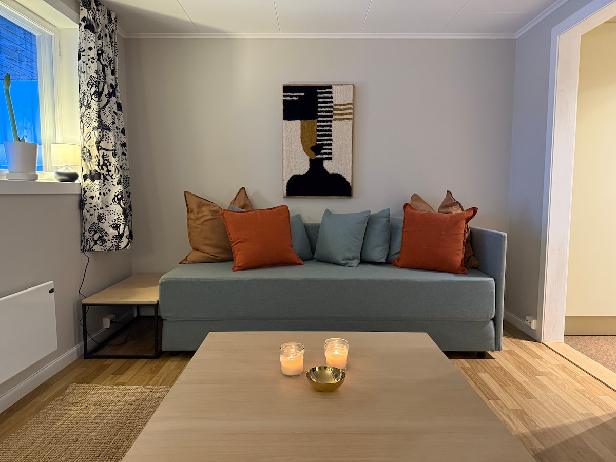 Praktisk, moderne og koselig leilighet med soverom (dobbeltseng) og hems (2 enkle senger). Kjøkken med alt du trenger til matlaging og romslig sitteplass. Minihuset ligger på en privat eiendom med grøntområder rundt. Parkering rett utenfor inngangsdøren.