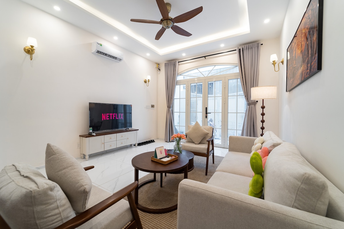 ✨Enjoy airy living with stunning 🌆 panoramic views of Saigon. This elegant home blends 🇪🇺 classic European charm with 🌏 modern Asian style. Perfectly located near Tan Dinh Market, the Pink Church and just 20 minutes away from the Airport, 10 minutes to the heart of District 1. Set in a prime location surrounded by local eateries, cafés, spas, and markets—just steps from iconic sights for the perfect city stay!
