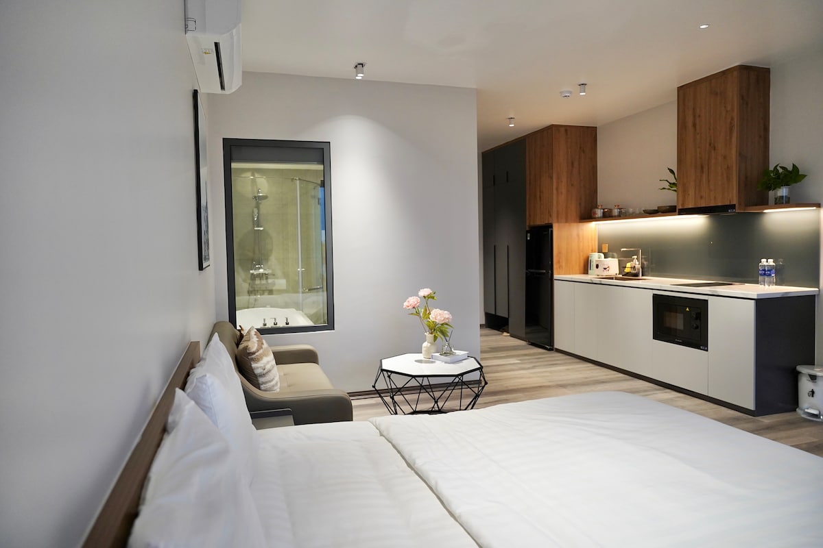 Tận hưởng kỳ nghỉ thoải mái tại căn hộ hiện đại với thiết kế tối giản, tông màu kem – be tinh tế. Khách được sử dụng miễn phí hồ bơi, phòng gym và chỗ đỗ xe ngay trong tòa nhà.