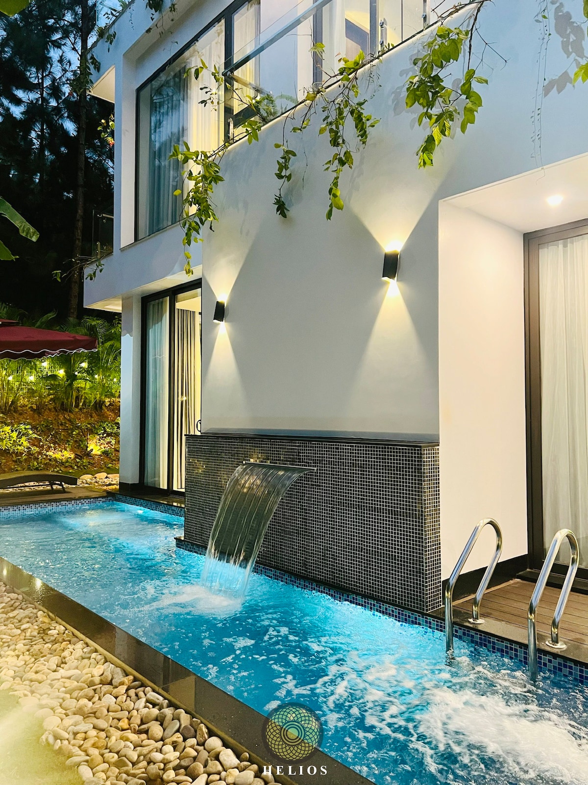 Rest and relax in the peaceful, poetic space of LIME House on the shore of Phu Nghia Lake, Soc Son, Hanoi. A duplex wooden house with large glass panels filled with light, hidden in a garden filled with chirping birds. In front of the house is a small wooden swimming pool, connected to a large porch, a dining table, a BBQ kitchen under a purple flower trellis. A long green lawn, next to a row of dark pine trees. 20 minutes from airport 60 minutes to Center Hanoi City.