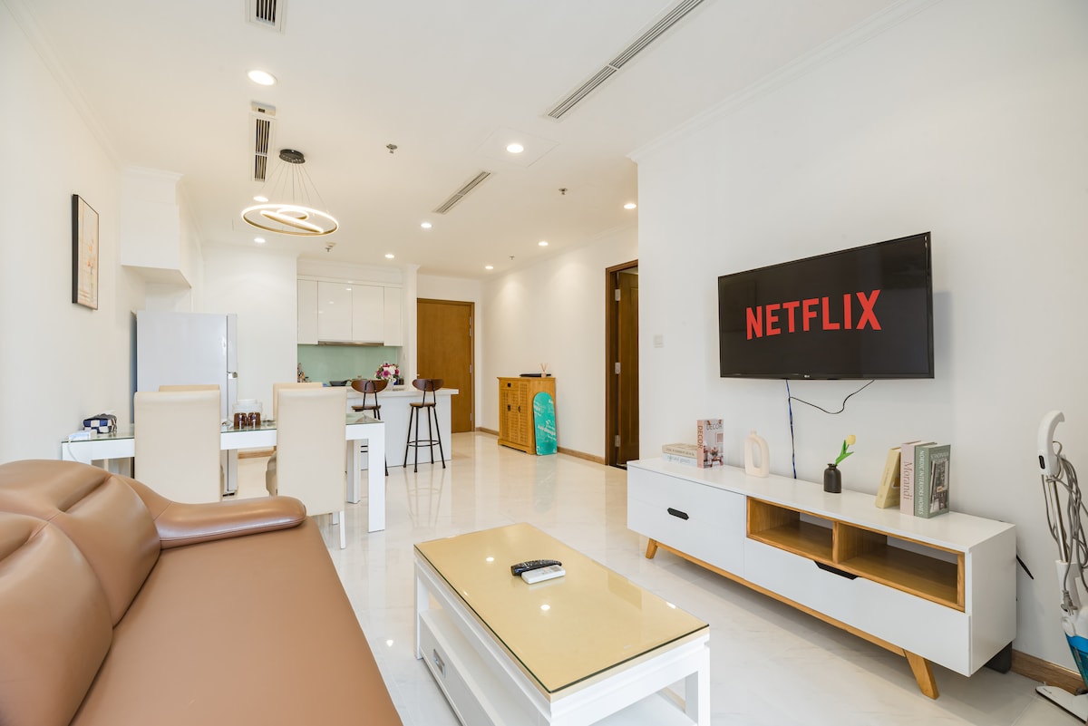 NETFLIX & CITY VIEW One of the special features we offer is a 4K-quality projector in the bedroom, allowing you to enjoy Netflix with a stunning city view — all from the comfort of your bed. This is a one-bedroom apartment located on the 40th floor of the Central 3 Building, Vinhomes Central Park. For long-term stays, we provide housekeeping service every 5 days. Fresh towels are also available upon request. Thank you for considering staying with us. We look forward to hosting you!