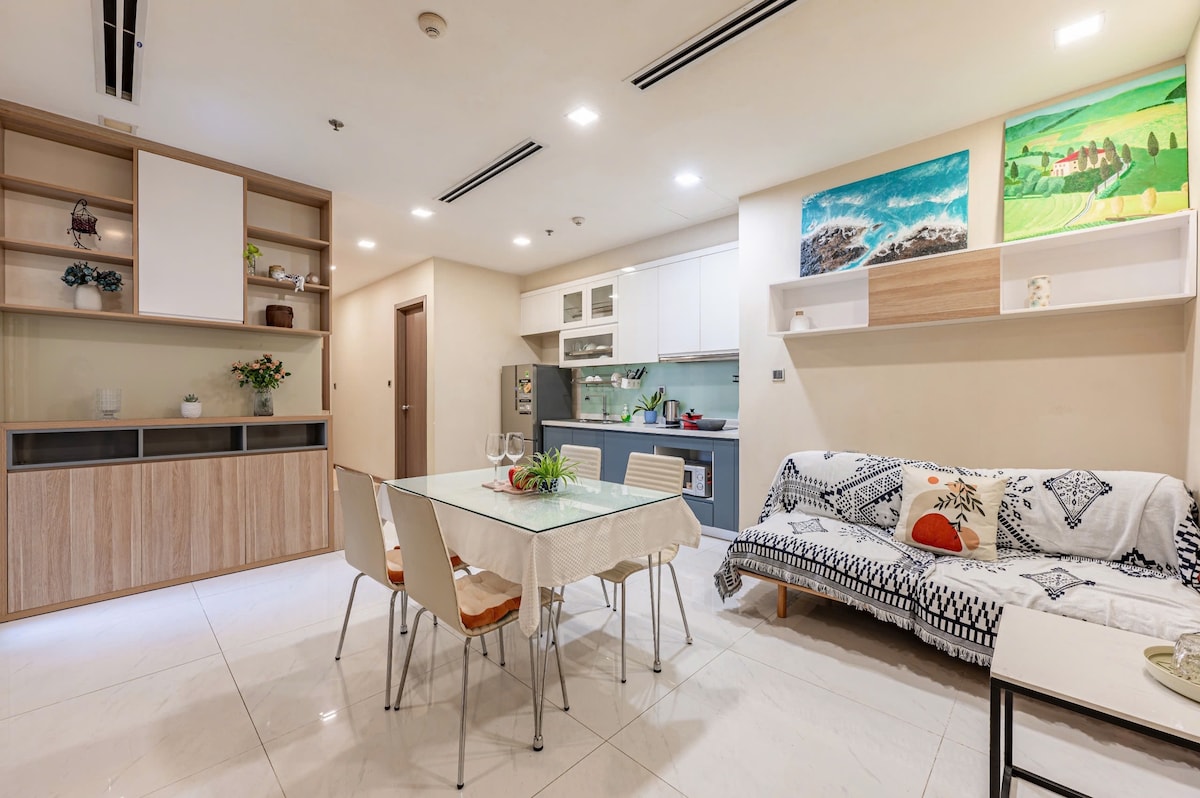 Cozy luxury apt on 6th floor located in a prime location just 10 minutes drive from the city center. 64sqm wide apt with all amenities and space to make you feel like at home. You can lie down on a soft king-size bed for a good night's sleep, cook in the kitchen, lie on the sofa watching the Landmark 81 building sparkle at night or sip a hot cup of coffee on the balcony watching the sunrise. A luxurious rooftop swimming pool, 2 mini supermarkets: 7 eleven and Winmart. Friendly and helpful owner.