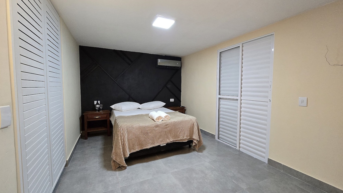 Dois apartamentos, cada um com 01 quarto, 01 banheiro e cozinha. acessos independentes. Localizados em área rural a 500 metros da entrada da cidade de Espírito Santo do Pinhal - SP. Ao lado do Clube de Campo Caco Velho. Equipados com ar condicionado, TV, cofre, secador de cabelo, micro ondas, geladeira, cafeteira e purificador de água.