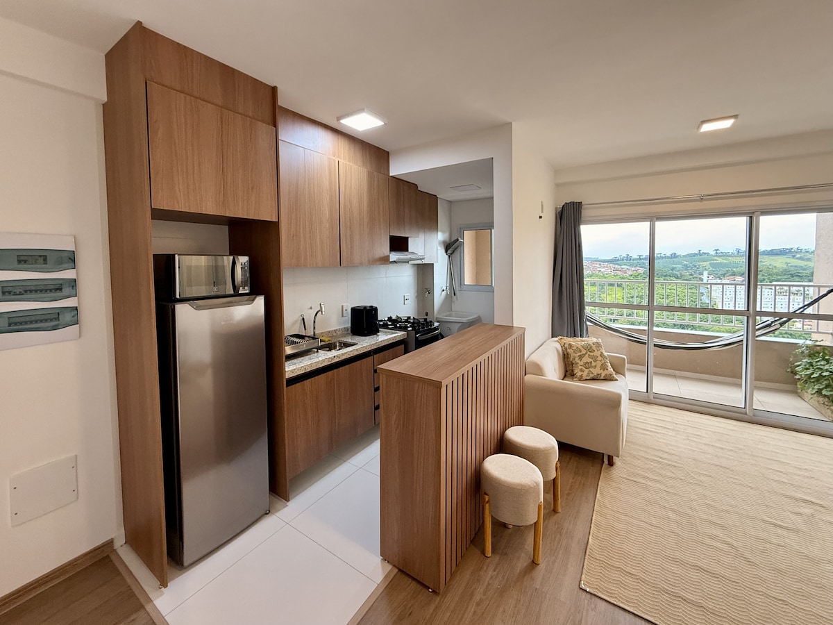 Bem-vindo a Espírito Santo do Pinhal. Apartamento recém-terminado, confortável e seguro, ideal para turistas e/ou profissionais. Um quarto com cama Queen; segundo ambiente equipado como escritório (mesa e cadeira) e armário. Cozinha e sala com utensílios e eletrodomésticos novos. Varanda com rede, boa localização, em bairro tranquilo, com vista para a Serra da Mantiqueira. Perfeito para casais que visitam vinícolas ou profissionais em viagem. Wi-Fi e vaga. Check-in flexível.