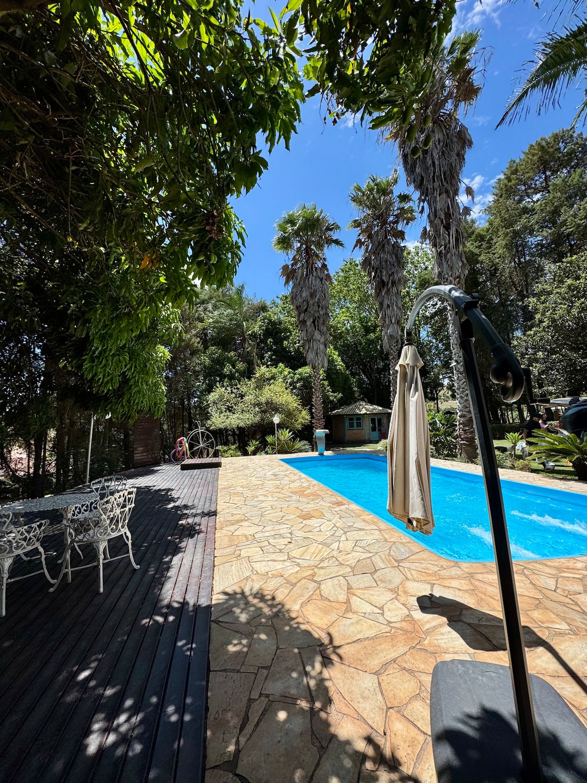 Deliciosa casa de campo,com varandas em todo seu redor, piscina e ótima área de lazer. Com sala, cozinha completa ,dois quartos e banheiro.Nas varandas você irá encontrar churrasqueira mesa e redes.A casa está localizada em um terreno de 3 mil metros totament independent,tendo um amplo terreno todo gramado ideal para seus pets.Em uma parte do terreno fica um lindo lago com peixes que é ideal para pesca com varas de bambu. No quintal é possível estacionar muitos carros.