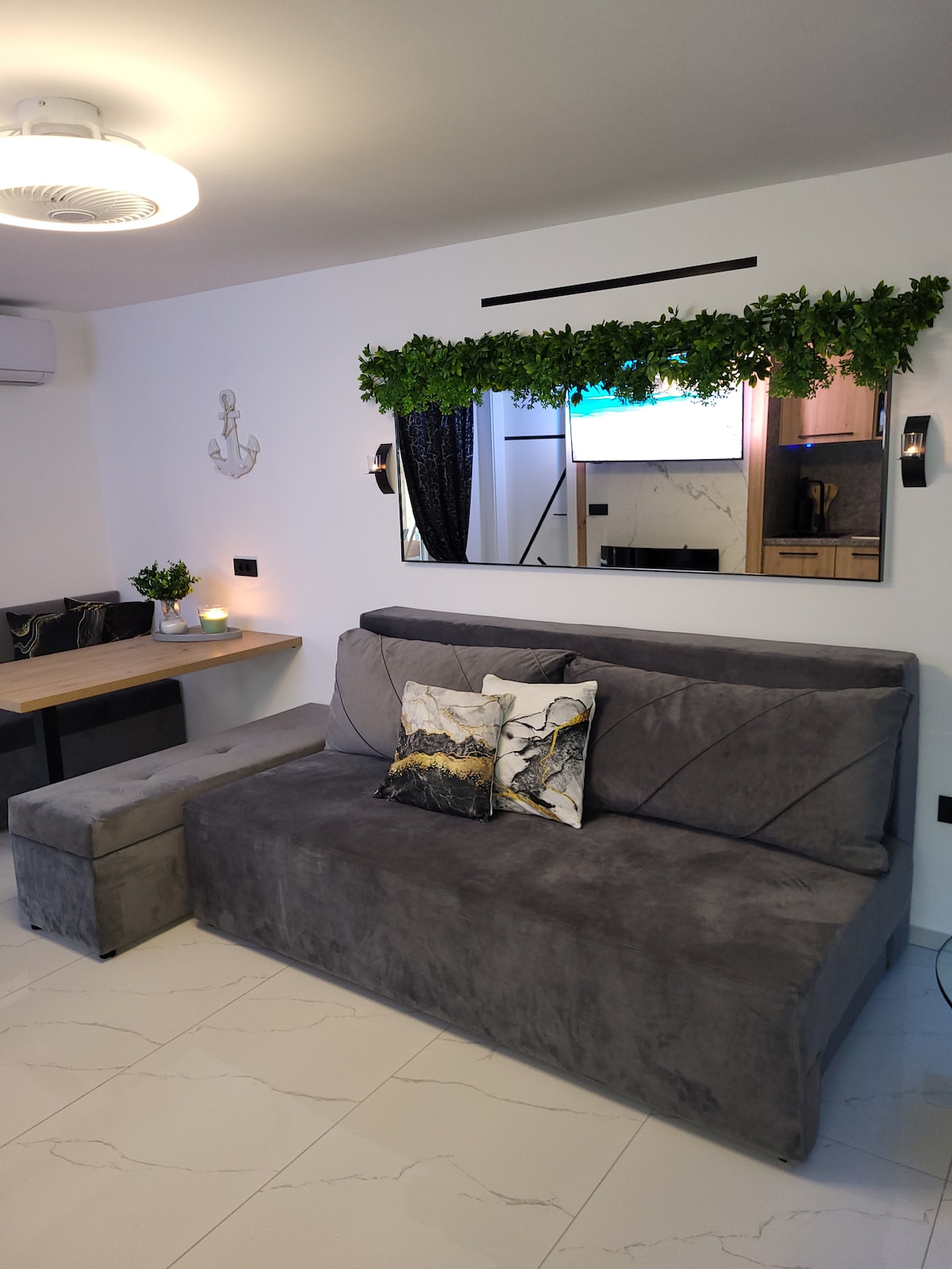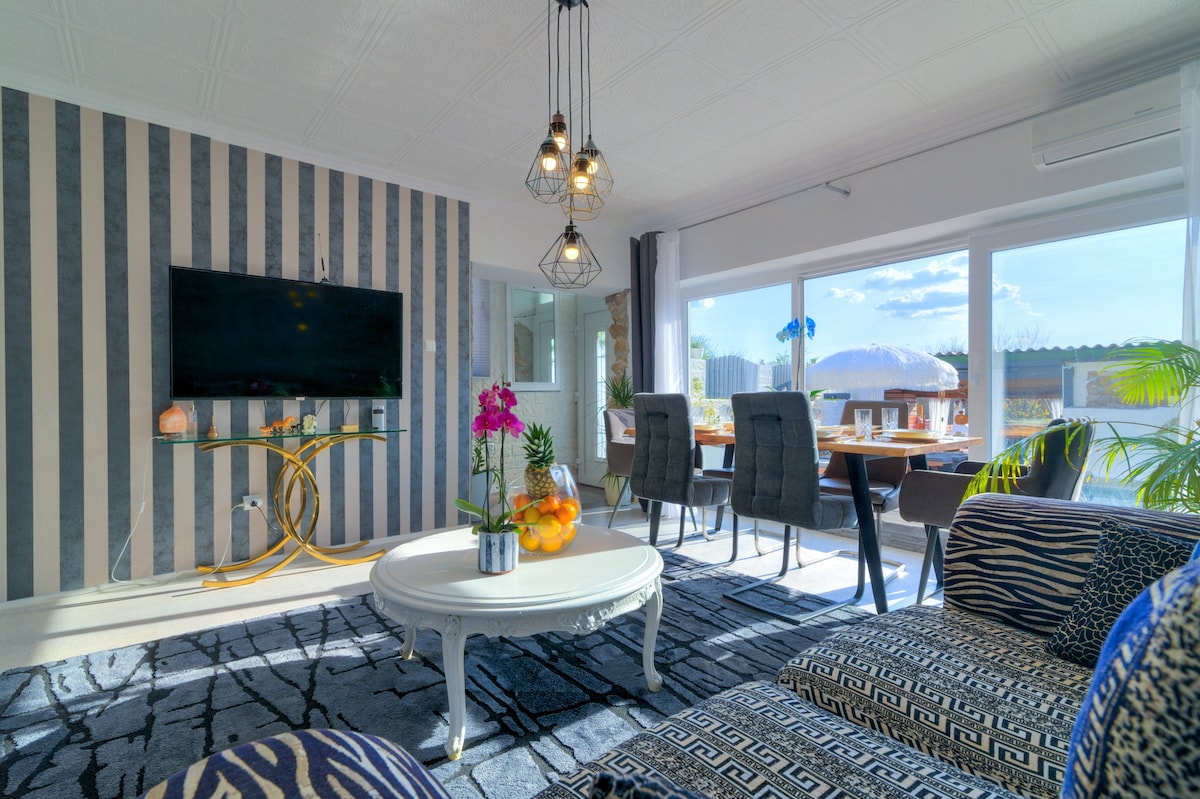 Enjoy this unique and newly decorated apartment, 600 m from the first beach on foot. The apartment is located on a hill. It is divided into two separate units, each of which is about 40 square meters in size. They do not have internal communication, so it is suitable for a vacation for couples/friends or families with older children, where everyone has their own privacy. The facilities are connected by an outdoor covered terrace. Most markets are 10-15 min walk from the apartment.